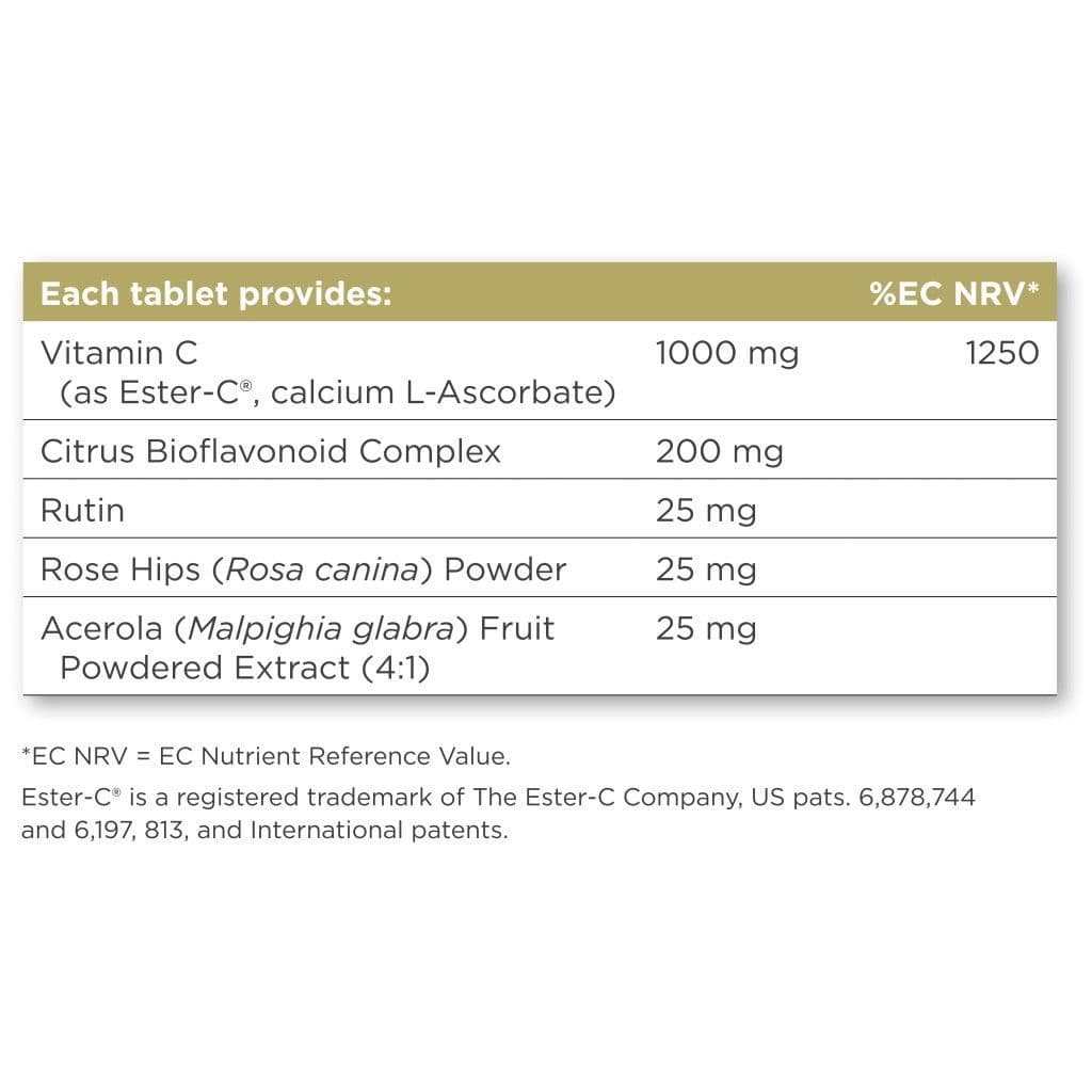 Ingredients: Vitamin C (as Ester-C®, calcium L-Ascorbate), Citrus Bioflavonoid Complex, Bulking Agents: (microcrystalline cellulose, dicalcium phosphate, hydroxypropyl cellulose), Anti-Caking Agents: (silicon dioxide, vegetable stearic acid, vegetable magnesium stearate), Rutin, Cross-Linked Cellulose Gum, Rose Hips (Rosa canina) Powder, Acerola (Malpighia glabra) Fruit Powdered Extract (4:1), Glazing Agents: (hydroxypropylmethyl cellulose, vegetable glycerin (from palm kernel oil and coconut oil)).