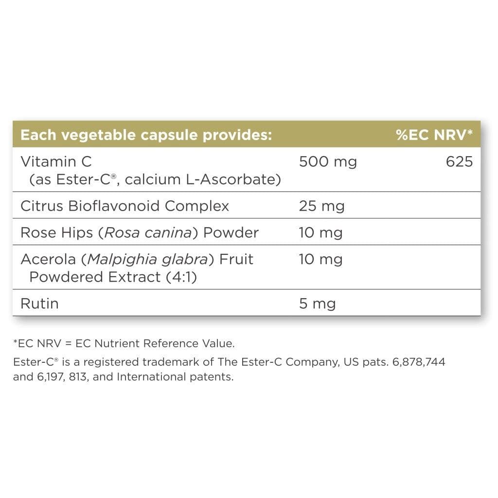 All Solgar® products meet our industry recognized Gold Standard for excellence. Made using naturally sourced ingredients and innovating since 1947, Solgar® is your perfect supplement to good health 98% of Solgar® consumers recommend the brand*Vitamin C (as Ester-C®, calcium-L-Ascorbate), Vegetable Capsule Shell: hydroxypropylmethyl cellulose, Anti-caking Agents: (vegetable magnesium stearate, silicon dioxide), Citrus Bioflavonoid Complex, Rose Hips (Rosa canina) Powder, Acerola (Malpighia glabra) Fruit Powder Extract (4:1), Rutin.